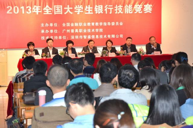 2013年11月24日,由全國金融職業(yè)教育教學(xué)指導(dǎo)委員會主辦、廣州番禺職業(yè)技術(shù)學(xué)院承辦、深圳智盛信息技術(shù)股份有限公司支持的“2013年全國大學(xué)生銀行技能競賽”在廣州番禺職業(yè)技術(shù)學(xué)院舉行。中國人民銀行中國金融培訓(xùn)中心主任、全國金融行業(yè)指導(dǎo)委員會常務(wù)副主任委員萬存知,中國人民銀行中國金融培訓(xùn)中心副主任、全國金融行指委常務(wù)秘書長馬玉蘭,廣州番禺職業(yè)技術(shù)學(xué)院副校長王曉敏,智盛公司總經(jīng)理彭家源等領(lǐng)導(dǎo)蒞臨比賽現(xiàn)場。來自全國84所高職院校的252名選手和領(lǐng)隊、指導(dǎo)老師以及相關(guān)單位和觀摩單位代表共700余人參加活動。
