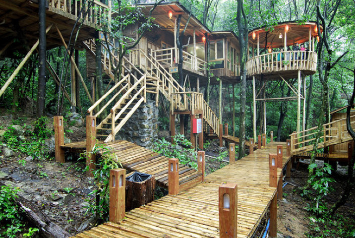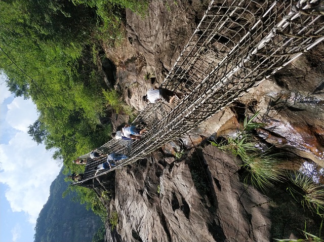 下午來到了英德——天門溝九州驛站;由驛站區(qū)和天門溝九站一廊高山森林峽谷景區(qū)兩大產(chǎn)品組成游覽。我們大隊人馬一邊爬山一邊領(lǐng)略沿途的風(fēng)景,上山路上都可見到沿山而下的水流,大概天門溝的名稱由來于此。水流在石頭凹陷處形成小水潭,清澈見底,而且十分清涼。