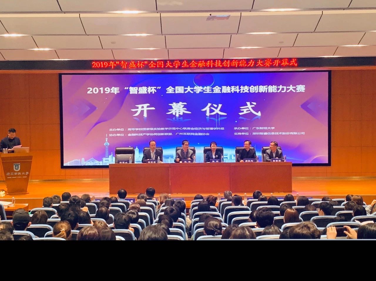 2019年“智盛杯”全國大學(xué)生金融科技創(chuàng)新能力大賽在廣東財經(jīng)大學(xué)國際學(xué)術(shù)報告廳正心堂盛大開幕。教育部高等學(xué)校國家級實驗教學(xué)示范中心聯(lián)席會經(jīng)管學(xué)科組副組長張莉、教育部高等學(xué)校國家級實驗教學(xué)示范中心聯(lián)席會經(jīng)管學(xué)科組秘書長周紅剛、天津大學(xué)管理與經(jīng)濟(jì)學(xué)部副主任楊寶臣裁判長、廣東財經(jīng)大學(xué)教務(wù)處處長張軍、廣東財經(jīng)大學(xué)金融學(xué)院院長段軍山、深圳智盛信息技術(shù)股份有限公司董事長彭家源出席本次開幕式。廣東財經(jīng)大學(xué)金融學(xué)院段軍山院長主持本次開幕式,最后,張軍處長宣布  2019年“智盛杯”全國大學(xué)生金融科技創(chuàng)新能力大賽正式開幕。