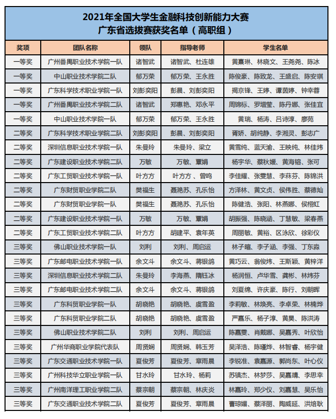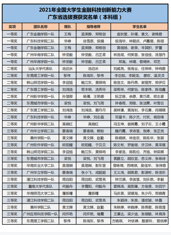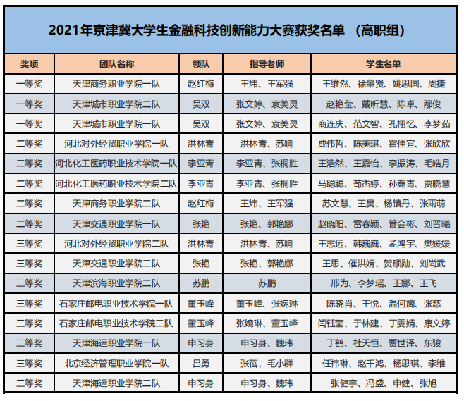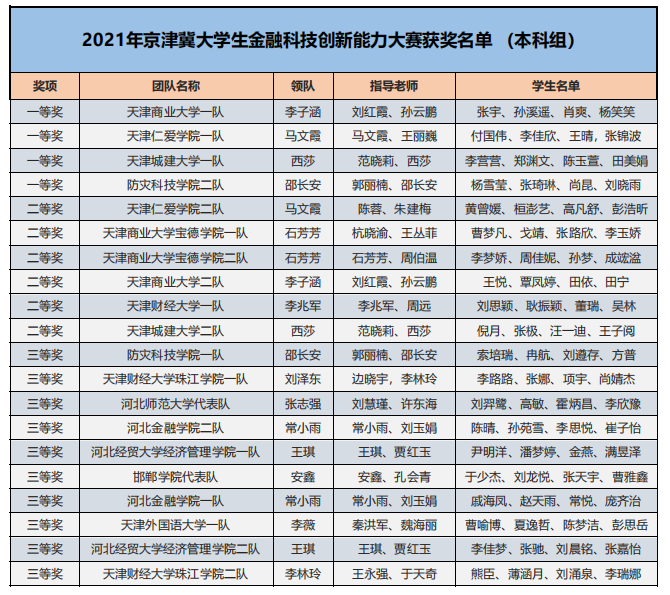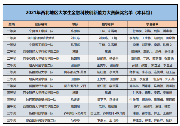 為了培養(yǎng)新一代青年大學(xué)生的金融科技創(chuàng)新能力,鼓勵(lì)對(duì)金融類專業(yè)人才創(chuàng)新意識(shí)和創(chuàng)新素質(zhì)的培養(yǎng)與訓(xùn)練,推進(jìn)本科與高職金融類專業(yè)“教、學(xué)、考、做、賽”五位一體的教學(xué)改革,推進(jìn)金融科技教育“工學(xué)結(jié)合、學(xué)做合一”;同時(shí)也是為適應(yīng)金融科技行業(yè)的蓬勃發(fā)展,對(duì)接金融科技企業(yè)人才需求,全面提升金融科技人才培養(yǎng),鼓勵(lì)創(chuàng)新意識(shí)、深化創(chuàng)新層次、激勵(lì)創(chuàng)新人才。在高等學(xué)校國家級(jí)實(shí)驗(yàn)教學(xué)示范中心聯(lián)席會(huì)經(jīng)濟(jì)與管理學(xué)科組的指導(dǎo)下,2021年“智盛杯”各省市地區(qū)大學(xué)生金融科技創(chuàng)新能力大賽已成功舉辦。根據(jù)活動(dòng)方案規(guī)定的獲獎(jiǎng)比例,現(xiàn)將各地區(qū)賽的獲獎(jiǎng)名單予以公布。