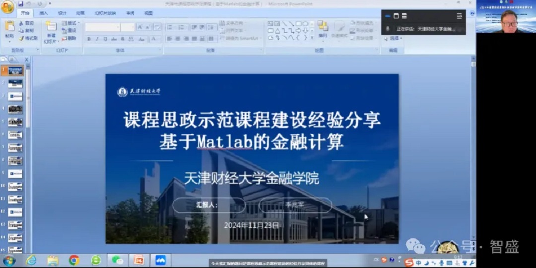 天津財經(jīng)大學(xué)金融學(xué)院李兆軍教授就基于 Matlab 的金融計算課程思政示范課程建設(shè)作經(jīng)驗分享。他先介紹課程由《金融計算與量化分析》教改而來,經(jīng)歷疫情上網(wǎng)課等,已獲校、市相關(guān)成果。接著從課程基本情況、目標(biāo)完成、教學(xué)手段、思政結(jié)合、改革創(chuàng)新點五方面展開匯報,提及依據(jù)教育部文件開展建設(shè),闡述課程各模塊內(nèi)容、考核方式,強(qiáng)調(diào)教學(xué)手段多樣,如講知識、小組討論、案例教學(xué)等,還談及網(wǎng)絡(luò)資源利用及思政融入需注意事項,包括突出職業(yè)、愛國、擔(dān)當(dāng)、工匠精神等,最后總結(jié)課程的基本指標(biāo)、創(chuàng)新點及建設(shè)過程是不斷完善的。